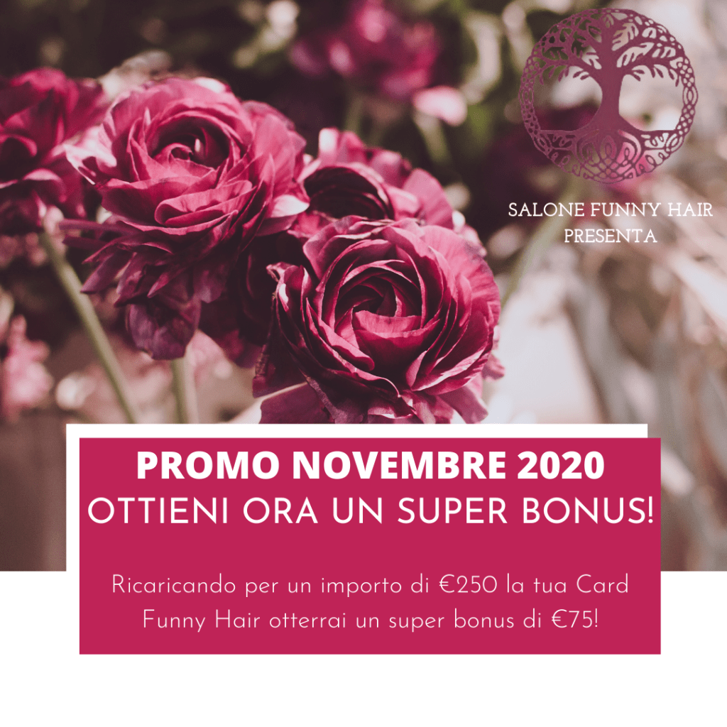 Quest’anno Salone Funny Hair ha deciso di anticipare il Natale e di premiare le sue clienti. Ricaricando per un importo di 250€ la propria Card Funny Hair, infatti, otterrete un super regalo: 75€ di bonus spendibili in tutti i servizi e prodotti del salone.